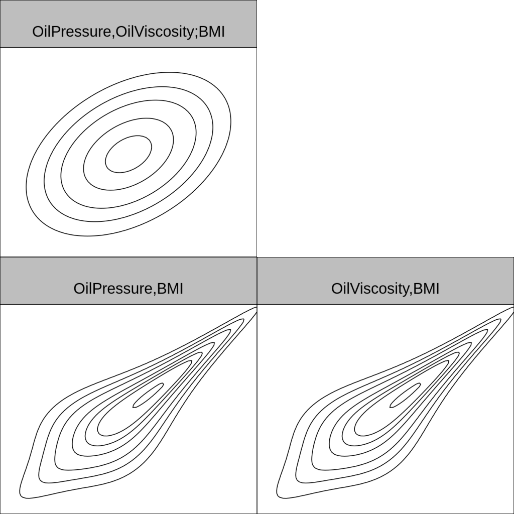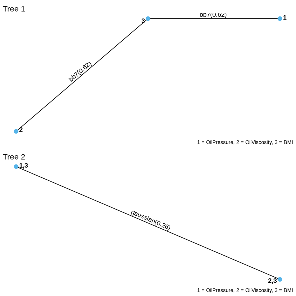 Here is the vine structure. You can see that at the first level, BMI depends on viscosity and on pressure via BB7 copulas. The second level of dependency is Gaussian and says that pressure and viscosity, given BMI, has Gaussian dependence.