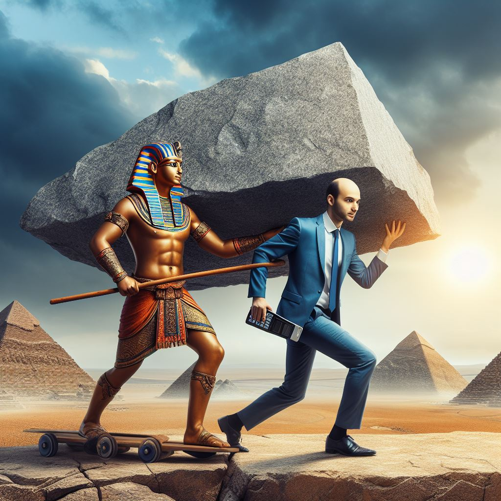 I asked DALL-E for the following to illustrate an actuary laboring heavily: imagine a scene of an ancient Egyptian hauling one of the pyramid stones, but the ancient Egyptian has been replaced by an actuary.